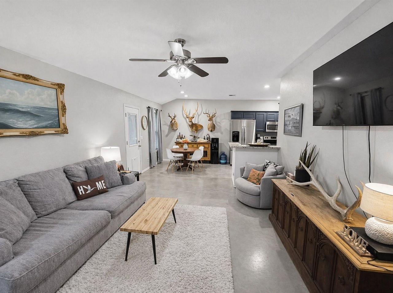 Beautifully maintained 3-bedroom, 2-bath home built in 2015, ideally located just minutes from town, top-rated schools, shopping, and dining. This inviting home features an open-concept living and dining area that flows seamlessly into a stylish galley kitchen equipped with stainless steel appliances. Durable stained concrete floors run throughout, offering both a modern look and easy maintenance.Step outside to a spacious, privacy-fenced backyard?perfect for relaxing, entertaining, or enjoying time with family and pets. Nestled on a quiet street, this home offers both comfort and convenience.Bonus: Oversized stainless steel washer and dryer convey with the property.