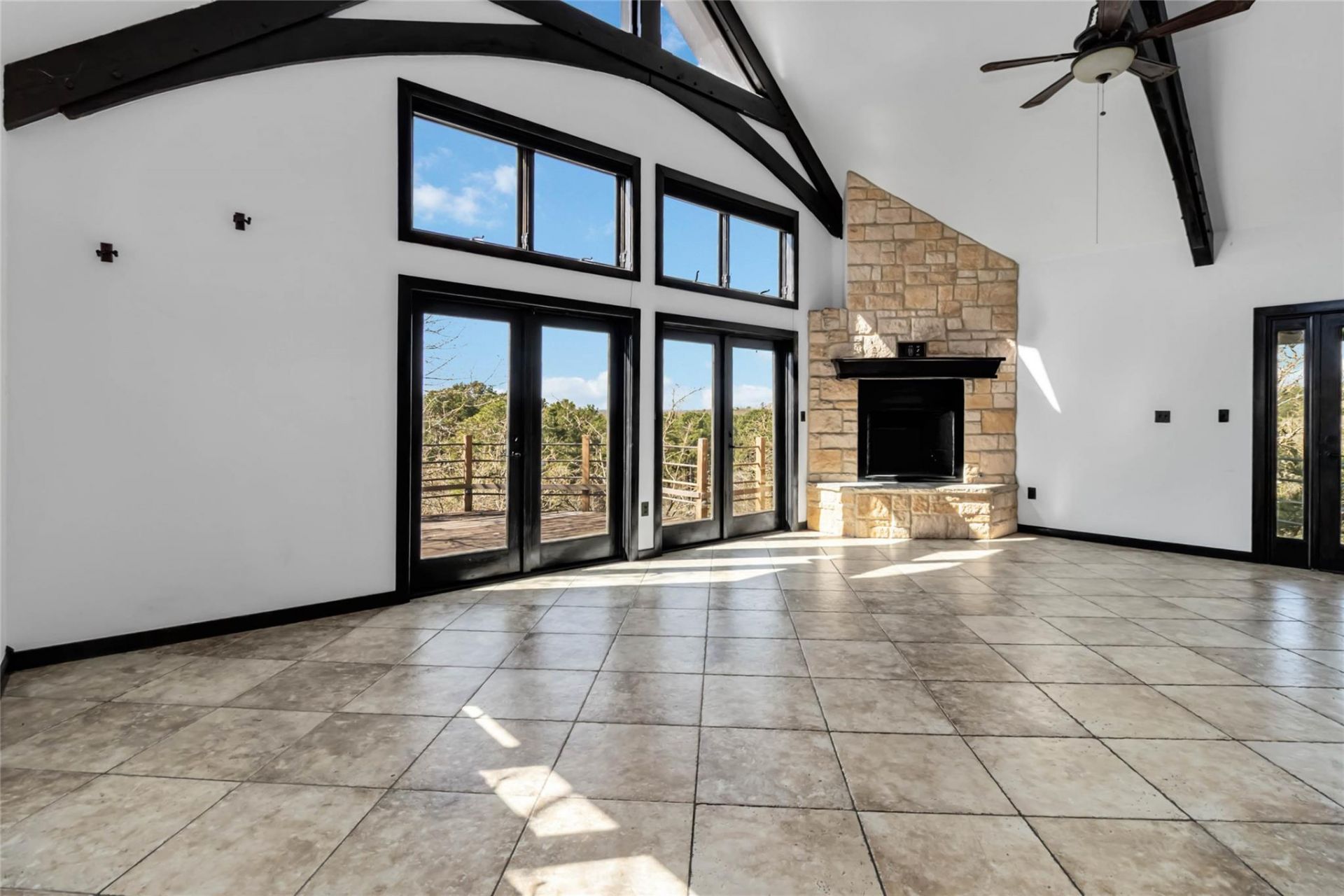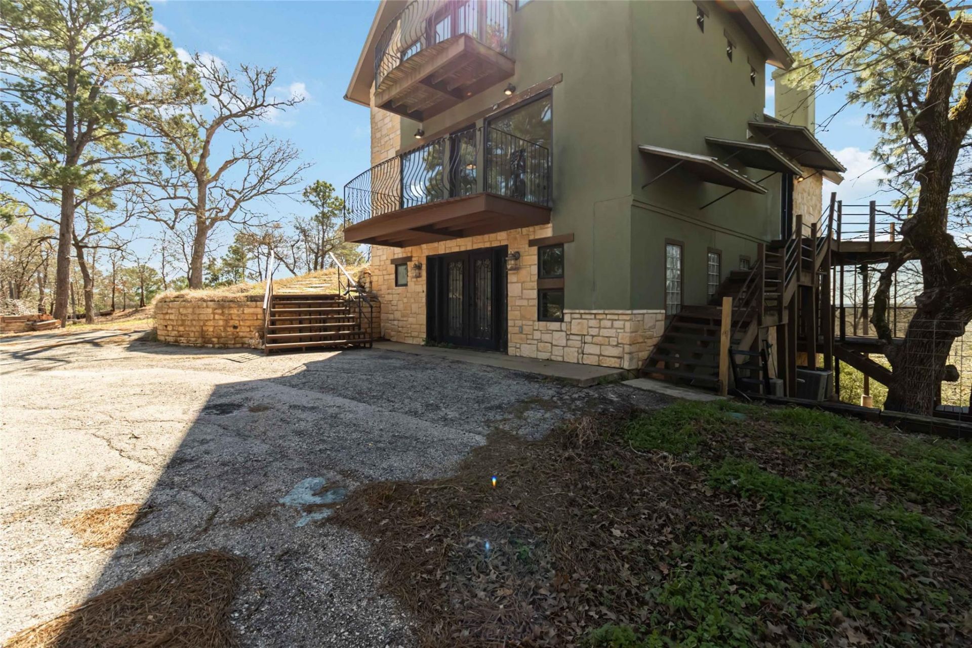 Dont miss this rare beauty in Tahitian Village offering amazing panoramic views located on a hilltop overlooking the old Golf Course. This home sits on almost 2 acres of private wooded land. There are several balconies with fantastic Views all around. There are 3 LEVELS ? Primary Bedroom is upstairs with a View Through fireplace, a copper tub so you can soak by the fire plus a Loft area. Primary Bathroom has copper sinks and a walk-in shower. The Living area is on the main floor. The living room has wood beam vaulted ceilings a large brick fireplace, a wraparound balcony and large windows for breathtaking views. The gourmet kitchen has a gas stove top, an island with an additional sink, double ovens, an abundance of cabinets and a dining area with floor to ceiling windows and another balcony. There is an office or additional bedroom off the dining area. There are two large bedrooms downstairs that share a Jack and Jill bathroom. **Deck Allowance with Full Price Offer