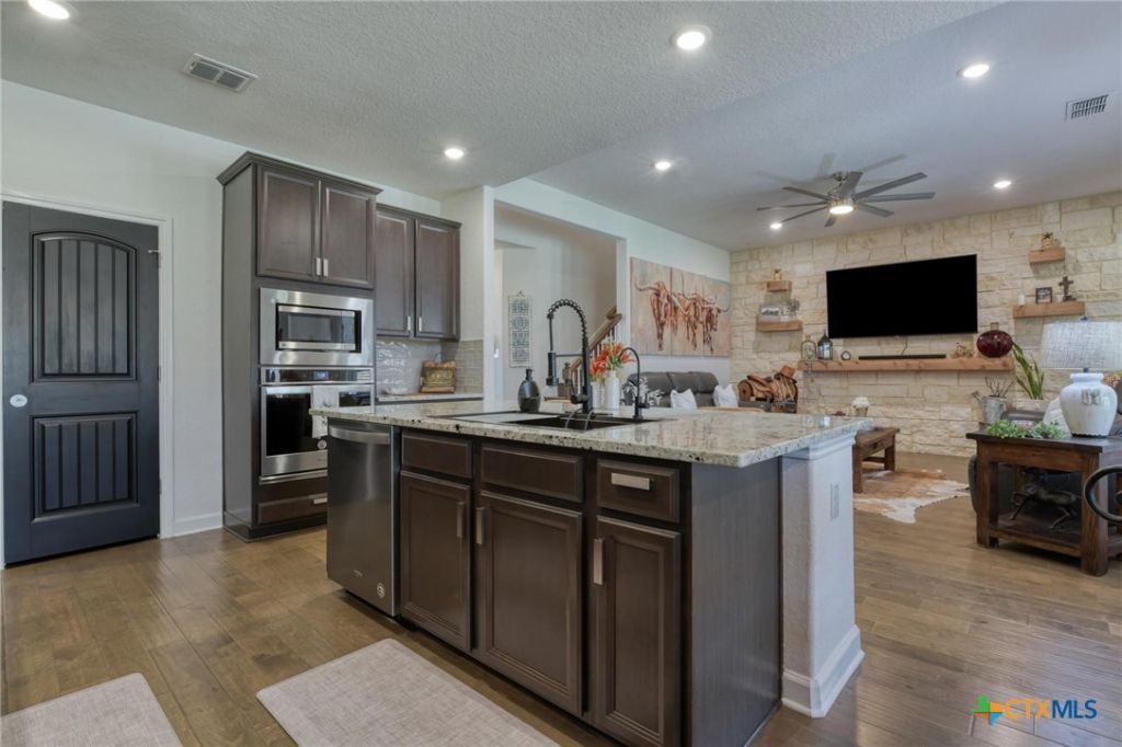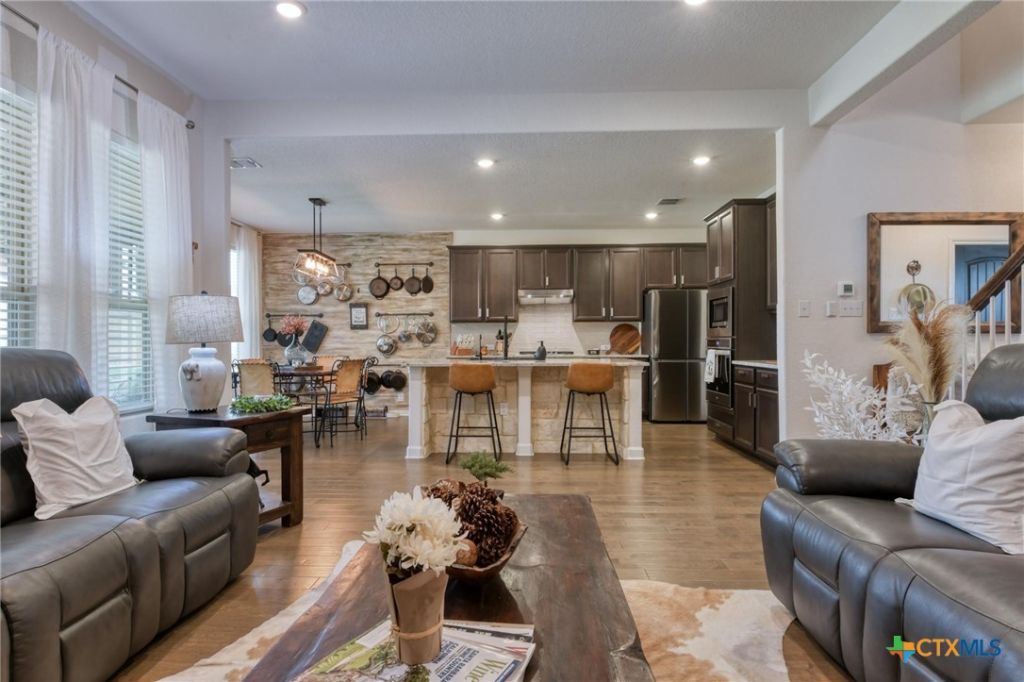 Meyers Ranch subdivision in New Braunfels Ashton Woods home! This 4-bed, 3.5-bath home features an office, two living areas, a 3-car garage, and an oversized driveway. Upgraded kitchen with large sink, custom pot-and-pan wall, gas stove, and big island. Recently replaced the stove. Living room includes custom stone accent wall. Enjoy a large covered deck and fire pit area for relaxing outdoors. Primary suite has an upgraded closet system and remodeled shower. Garage includes extensive storage. Located on the only street with a landscaped island divider. Community amenities include a fitness center, resort-style pool, splash pad, playground, dog park, putting green, walking trails, and The Haus. New Comal ISD elementary coming soon; zoned to Smithson Valley schools. A move-in-ready home you don't want to miss!