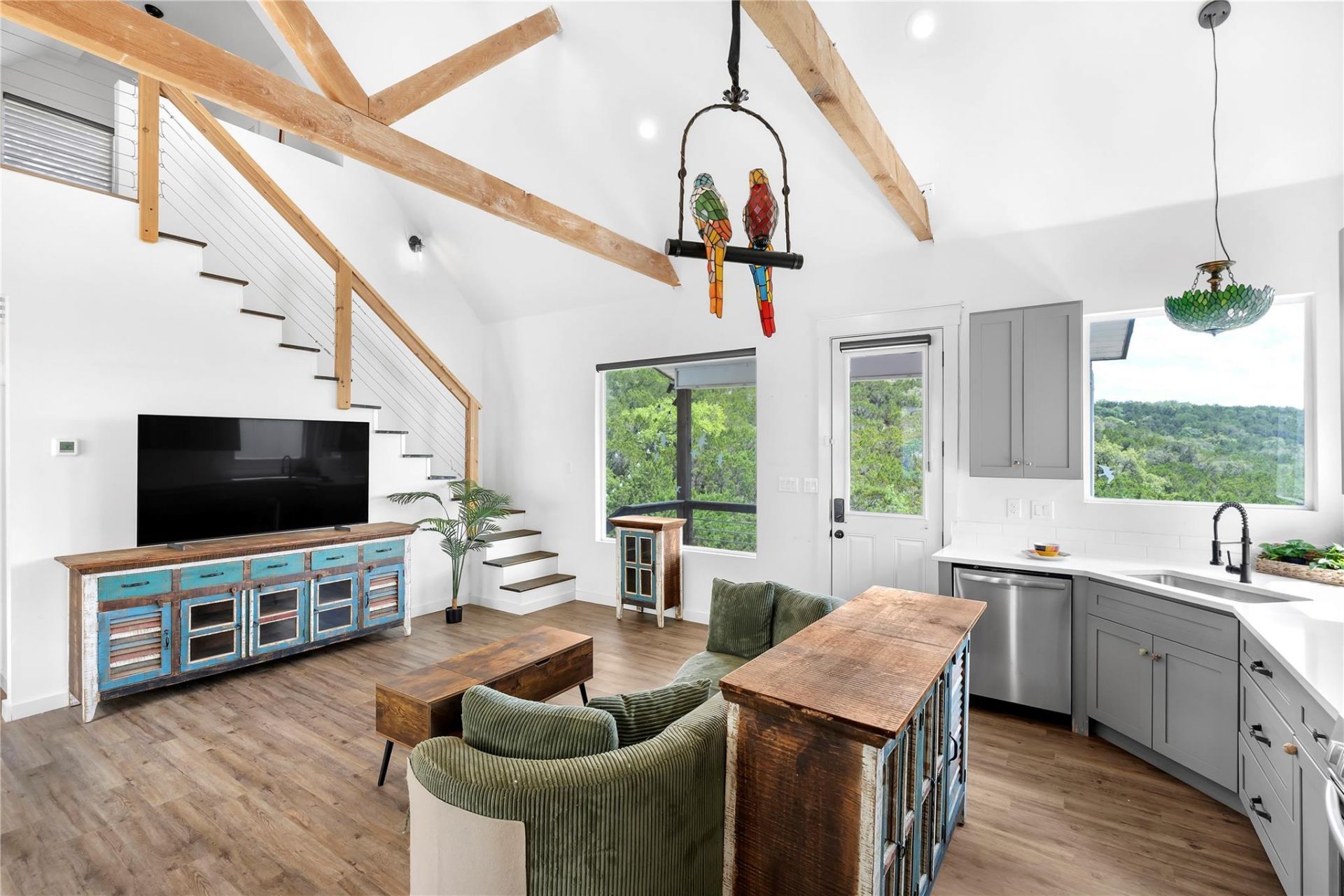 AMAZING HILL COUNTRY VIEWS!!! This adorable Hill Country Gem is being sold with 5 additional lots. Discover this truly unique, modern-style 2-story home perched perfectly on a hill to capture sweeping, panoramic Hill Country views. Designed to maximize light and scenery, the home features high beamed ceilings, recessed lighting, and a stunning picture window over the kitchen sink that frames rolling hills and serene valleys. The primary bedroom is conveniently located on the main level, offering comfort and ease of living. Upstairs, a cozy loft with its own private bathroom creates the perfect guest space, studio, or second retreat. Enjoy the benefits of owned solar panels, included with the property for added efficiency and lower energy expenses. Step outside to a multi-level deck built for relaxation and enjoyment. Take in the breeze, unwind with a morning coffee, or sway on the charming swing overlooking the expansive landscape. With close proximity to Canyon Lake, this property embodies the ideal Hill Country getaway. All appliances, including a stacked washer and dryer, convey with the home-making it move-in ready or turnkey for a vacation rental. Even better, this sale includes the lot next door plus four additional lots across the street, offering incredible potential for privacy, expansion, or future investment opportunities. Just 1 mile from Canyon Lake Boat ramp number 1 and less than half a mile from a nature trail for those who enjoy a good hike. A one-of-a-kind retreat with views, charm, and endless possibilities-welcome to your Hill Country hideaway.
