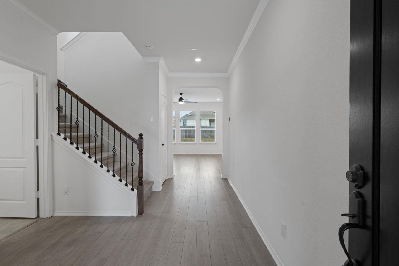Modern, thoughtfully upgraded, and designed for effortless everyday living, this two-story home blends comfort and style in a highly convenient location. The open floor plan features abundant natural light, crisp crown molding, and light wood-style floors that create a clean, airy, and cohesive feel throughout the main level. A dedicated first-floor office offers privacy for work or study, while the spacious living and dining areas flow seamlessly into a chefs kitchen equipped with quartz countertops, stainless steel Energy Star appliances, and generous workspace for cooking and entertaining.Upstairs, a versatile loft provides additional living space ideal for a media room, play area, or cozy lounge. The primary suite is a relaxing retreat, complete with a large walk-in shower and a well-appointed en suite bath. Two secondary bedrooms and an additional full bathroom complete the second floor, providing comfort and flexibility for guests, family, or hobbies. Installed in the garage is a water softener loop enhancing making future upgrades effortless.Outdoors, the backyard offers room to unwind, garden, grill, or simply enjoy warm Texas evenings. With convenient access to top-rated schools, parks, shopping, dining, and entertainment, this home truly balances modern convenience with a warm and welcoming atmosphere. Easy to live in, clean, functional, and inviting, its a home that works beautifully for everyday life?and feels just as good to come home to.