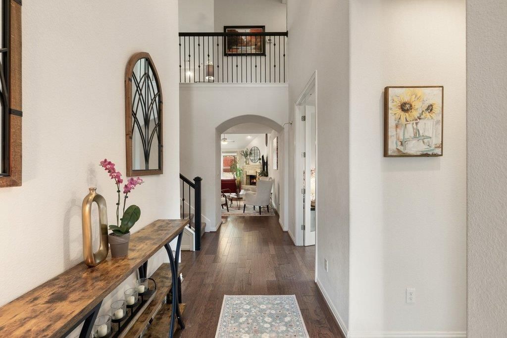 Welcome to 22308 Chipotle Pass, a Highland Home that stands out for its thoughtful design and prime cul-de-sac location within walking distance to West Cypress Hills Elementary and the future Highland Lakes High School!This 4-bedroom, 3-bath home with a dedicated office and formal dining offers a bright, open layout with vaulted ceilings in both the entry and living room, filling the home with natural light. Warm hardwood floors extend throughout the main living areas, creating a clean and inviting feel.The kitchen is spacious and functional, featuring granite countertops, bar seating, an eat-in breakfast nook, walk-in pantry, and a reverse osmosis system. It opens seamlessly to the living room, where large windows frame backyard views and a dramatic stone fireplace anchors the space. The formal dining area is enhanced by a striking accent wall and upgraded lighting, with additional upgraded fixtures in the kitchen nook.The main level includes a private primary suite with vaulted ceilings and backyard views, along with a spa-like bath featuring a soaking tub, walk-in shower with rain fixture, dual vanities, a dedicated makeup area, and a custom walk-in closet. A guest bedroom with full bath and a private office with double doors provide flexible living options.Upstairs, a large bonus room overlooks the living area and offers versatile space for a media room, game room, or additional living area, along with two spacious secondary bedrooms and a full bath.Enjoy a level backyard with lush lawn, covered patio with fan, custom hardscaping for additional seating, and a gazebo perfect for entertaining.Residents enjoy a resort-style pool, trails, sports courts, soccer field, playground, picnic areas, and community events.