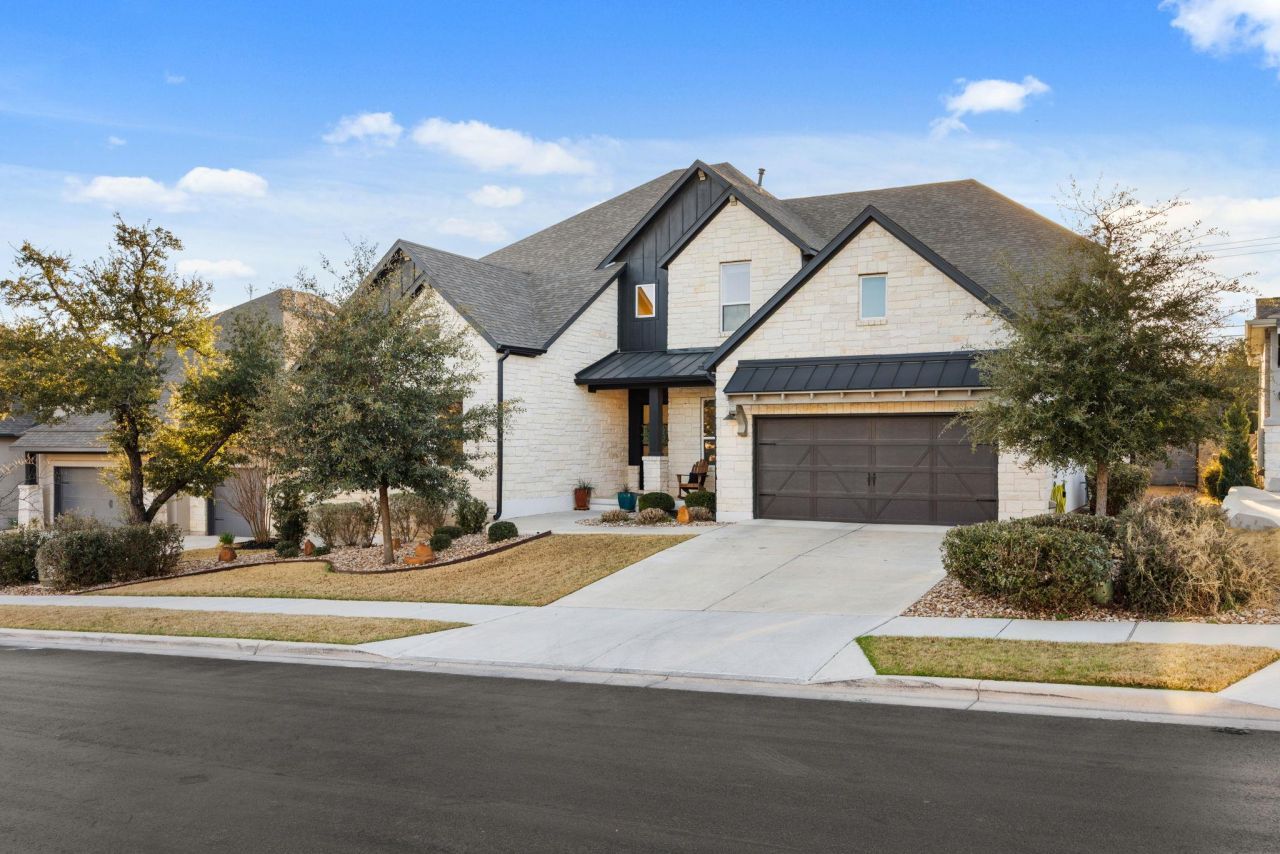 Discover refined Hill Country living in the highly desirable Wolf Ranch community of Georgetown. This like-new 2020 Grantley plan by Drees offers 4 bedrooms and 4.5 baths with a spacious, thoughtfully designed layout that blends comfort with elevated style. Soaring vaulted and beamed ceilings, a dramatic staircase, and a wall of windows create a striking first impression while filling the open-concept living spaces with natural light. The sleek Euro-style kitchen has a large center island, upgraded lighting, and seamless flow into the dining and family rooms?perfect for entertaining. The main level includes two primary suites - the first primary suite with custom California Closets, and a secondary suite with a full second kitchen with gas oven/range, microwave, and dishwasher - ideal for guests or in-laws. The main level also has a dedicated office. Multiple living areas provide flexibility, with a great room and additional family space downstairs, plus an upstairs gameroom, media room with custom built-ins, study nook, and two additional bedrooms. Interior upgrades include wide-plank engineered hardwood flooring on the first floor and stairs, fresh paint and baseboards, Shaw Pet Perfect carpet with memory foam padding upstairs, designer lighting, ceiling fans, motorized shades, and an upgraded gas fireplace with Spanish tile and brick facade. The laundry room features Saltillo tile. Outdoor living shines with a Cantera wrought iron front door, xeriscaped front yard, expanded covered deck with hot tub, horizontal iron railing, sport court, artificial turf, and evergreen privacy trees. With no rear neighbors and a peaceful tree-lined backdrop, enjoy beautiful sunrises from the front porch and sunsets from the patio. Additional highlights include a water softener, Tesla EV charger, and custom garage storage. Ideally located near neighborhood amenities, Georgetown Country Club, Wolf Ranch Town Center, the San Gabriel River, and Georgetowns vibrant downtown Square.