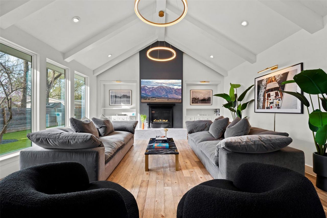 3112 Garwood immediately impresses with clean architectural lines, subtle curved walls, and a striking dark standing seam metal roof contrasted by crisp board and batten siding. A private courtyard drive offers a refined sense of arrival while enhancing privacy from the street. Inside, wide plank wood floors guide you to the central kitchen and continue into a vaulted living room filled with natural light. Exposed beams, oversized windows, and refined marble details add warmth and scale, creating an inviting space for everyday living and entertaining. The kitchen blends thoughtful design with everyday functionality. Custom cabinetry, marble backsplash, quartz countertops, and brass pendants frame an oversized island that naturally becomes the home's social hub. Sleek integrated appliances maintain clean lines while reinforcing the kitchens polished, high-end design.Thoughtfully chosen finishes infuse the home with personality and depth. Vibrant, color-rich spaces and a powder bath with striking wallpaper create a sense of artistry that sets this home apart from typical new construction.Upstairs, the primary suite is bright, private, and thoughtfully designed, with smart blinds that let natural light adjust throughout the day. The space flows into a dramatic bathroom with soaring ceilings, crystal chandeliers, double vanities with marble counters, a freestanding soaking tub beneath the window, and a spacious walk-in shower. A custom closet with floor-to-ceiling cabinetry, sculptural millwork, and open display shelving creates a dressing space that feels both elevated and highly functional. A covered patio with patterned tile extends to a landscaped backyard with lush turf and a pool designed for year-round enjoyment with heating and cooling from 40 to 104 degrees. Set among East Austin favorites like Machine Works, De Nada Tacos, East End Ballroom, and Kinda Tropical, this address places you at the heart of the East Side, minutes away from downtown Austin.