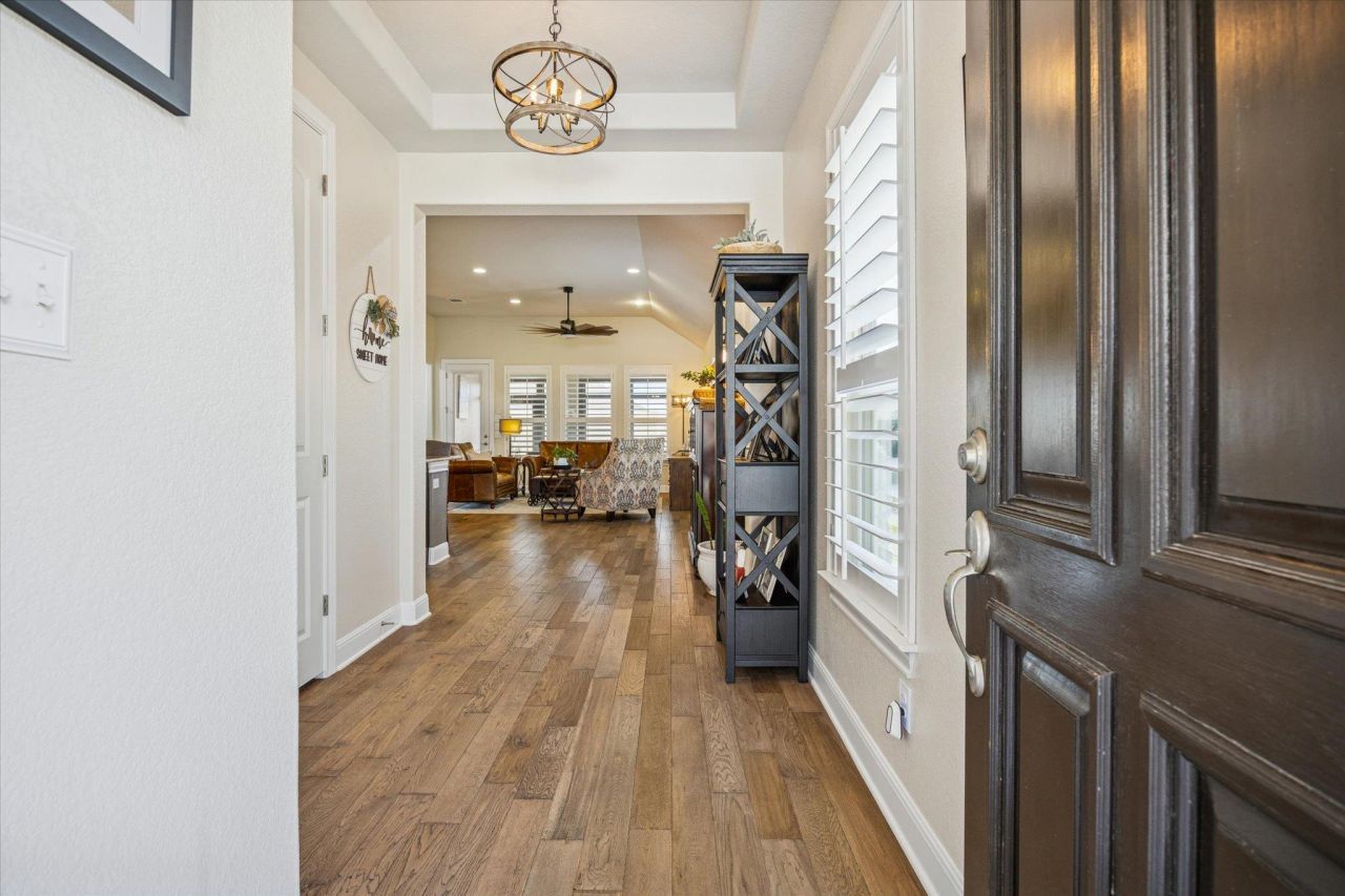 Beautiful, meticulously maintained, single-story Taylor Morrison home in Heritage at Vizcaya, Round Rocks premier 55+ community, offering easy, elegant, resort-style living in a vibrant and welcoming setting. This like-new, nicely updated home features an open floorplan with high ceilings and abundant natural light, designed for both everyday comfort and effortless entertaining. In addition to the spacious bedrooms, the home also includes a dedicated office/study?perfect for working from home, managing hobbies, or creating a quiet reading retreat. Recently installed plantation shutters throughout the home add a timeless touch of sophistication while enhancing privacy and light control. The kitchen is truly the heart of the home, highlighted by a huge, stunning island that opens seamlessly to the living area, creating the perfect gathering space. The oversized primary suite provides a peaceful retreat, complemented by an amazing, beautifully updated bathroom, while the secondary bath has also been thoughtfully renovated with stylish finishes. Step outside to enjoy a covered, screened-in patio plus an additional open patio area, ideal for relaxing, entertaining, or BBQing in the low-maintenance backyard. A recently replaced roof adds peace of mind, and the manageable yard allows for more time to enjoy the communitys active lifestyle. Located just minutes from shopping, dining, major highways, and hospitals, this home combines modern design, serene surroundings, and the benefits of an engaged social community, delivering the best of 55+ living in one exceptional Round Rock property.