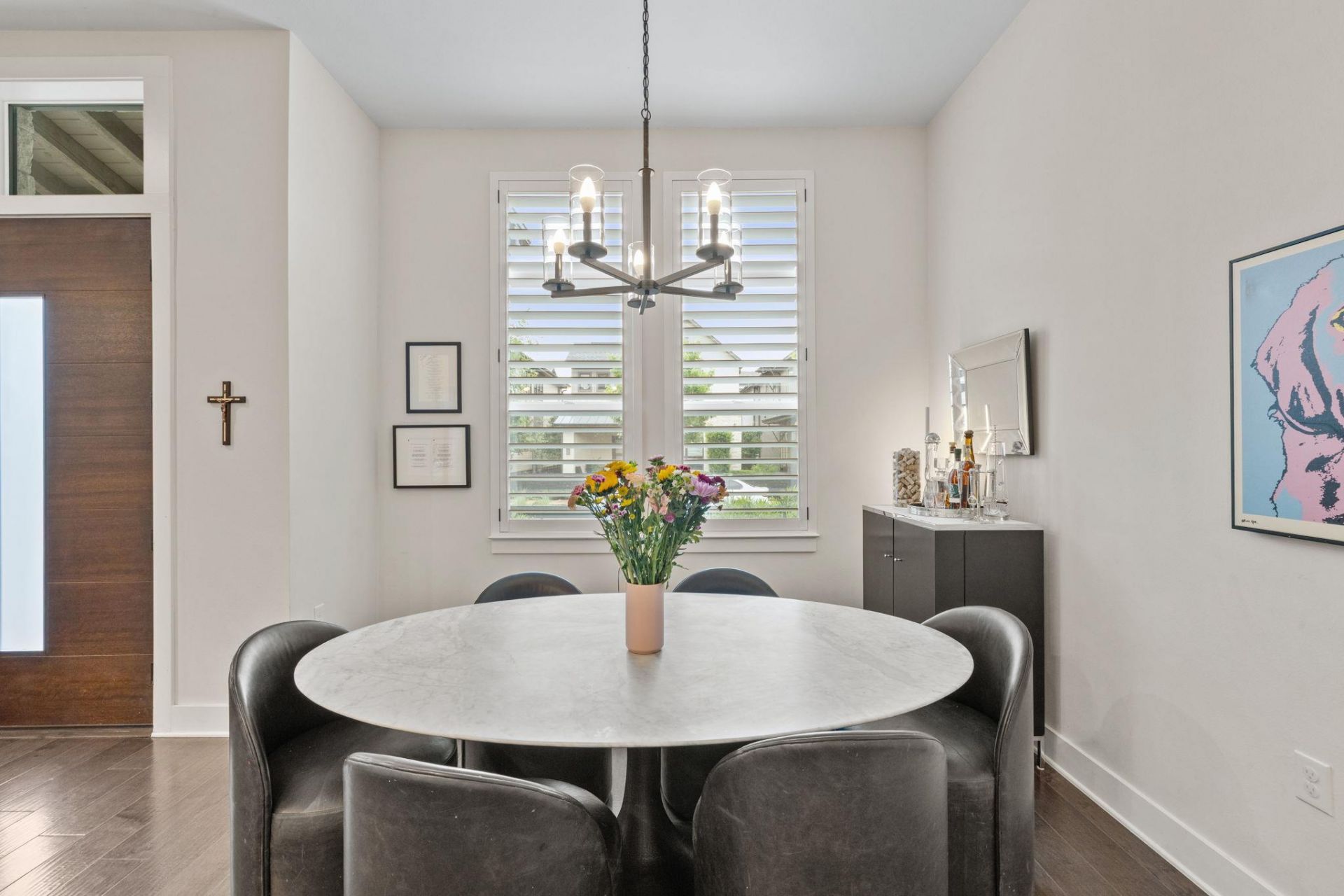 Thoughtfully designed to balance refined entertaining with effortless everyday living, this home features a highly functional two-story layout with a main-level primary suite, beautifully scaled living spaces, and three additional bedrooms upstairs, offering both privacy and flexibility.Elevated throughout with curated upgrades, the interiors showcase wide-plank wood flooring, custom plantation shutters, and a sophisticated kitchen appointed with quartz countertops, double ovens, a built-in wine bar, and under-cabinet lighting. Custom California Closets systems in both primary closets and a secondary bedroom, along with a designer mudroom with built-in bench, bring a seamless blend of style and organization.Outdoor spaces have been enhanced with professionally turfed front and side yards, upgraded landscaping, and concrete-finished front and side porches creating a polished, low-maintenance setting ideal for lock-and-leave living. The epoxied garage with custom storage system further elevates functionality.Additional features include a tankless water heater, EV charger prewire, expanded recessed lighting, and whole-house central vacuum system.Offered fully turnkey, the home includes washer, dryer, and refrigerator, with HOA-maintained landscaping for added ease. Ideally situated within The Grove, the home offers access to thoughtfully designed green spaces, walking trails, and one of Austins most centrally located communities.