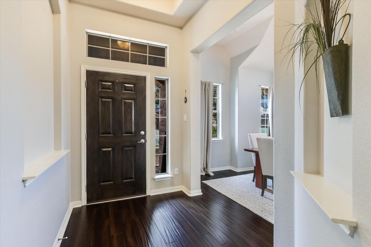 Beautifully maintained single-story home offering 3 bedrooms, 2 bathrooms, and a dedicated office or flex room within 1,880 square feet of open-concept living space. Built in 2014, this home features vaulted ceilings and bamboo flooring throughout the main living areas. Natural light fills the home, highlighted by window seats in both the kitchen and living room. The kitchen includes granite countertops, stainless steel appliances, and an open flow into the living and dining areas. The primary suite offers dual vanities, a garden tub, and a separate shower. Additional storage shelving in the laundry room adds everyday functionality. The professionally xeriscaped yard is designed for low-maintenance living and features crushed granite, stone borders, a flagstone patio, and a dry riverbed. Mature trees provide shade and added privacy. Located in the desirable Vista Ridge neighborhood with access to a private community pool and playground. Convenient to public transit, shopping, dining, and commuter routes.