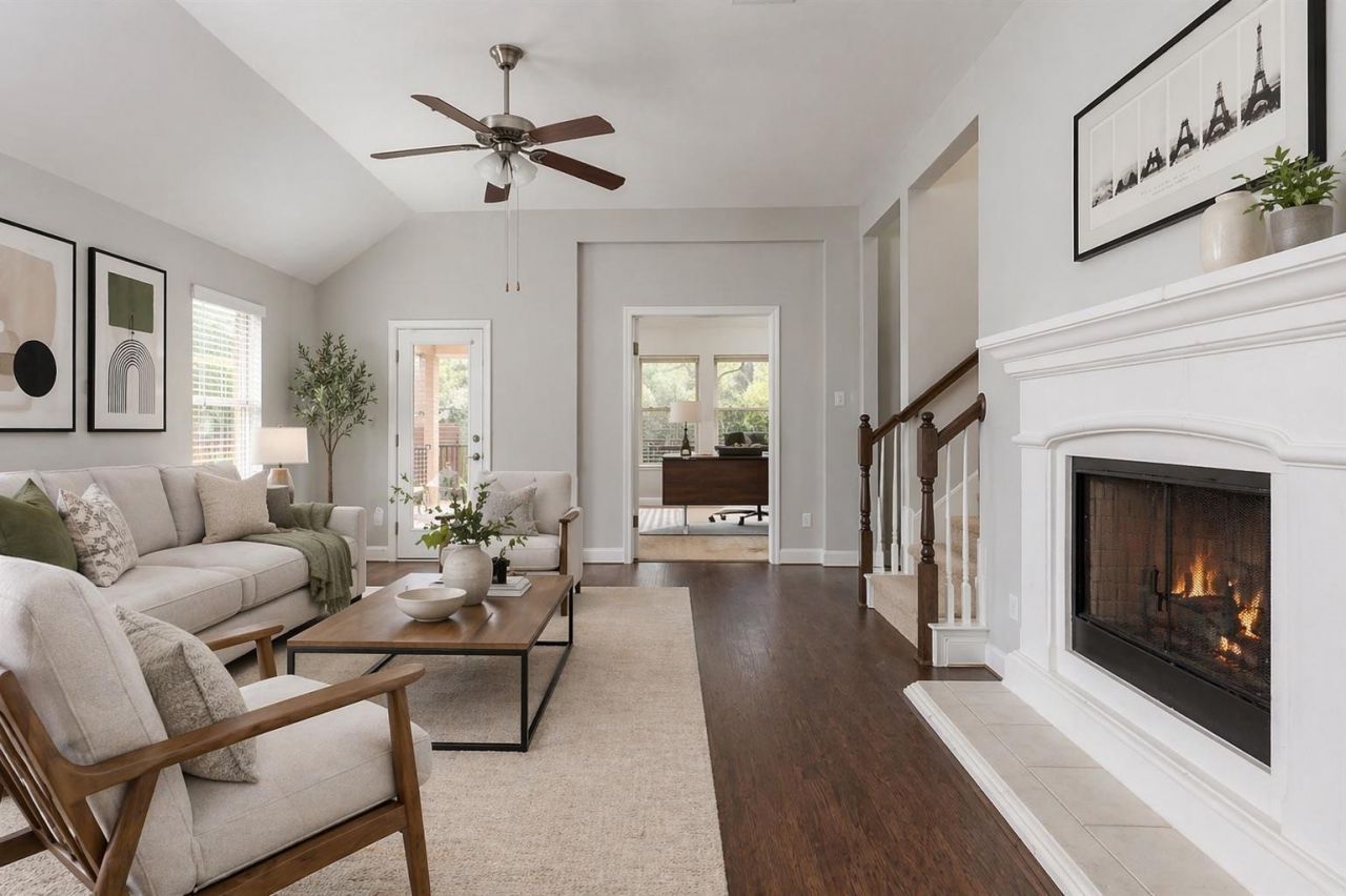 Welcome home to this incredible home with the perfect open floor plan in the sought after neighborhood of Sweetwater. This home offers an upstairs retreat with full bedroom and bathroom that can also be used as the perfect media room or guest suite. Downstairs features 4 bedrooms with a large dedicated office. The large kitchen boasts a center island, providing ample prep space and additional seating for dining. The spacious living area invites comfort with its cozy fireplace and high vaulted ceilings that enhance the feeling of space and light. The layout encourages easy flow from one room to another with gleaming hardwood floors that tie the spaces together. The natural color palette and abundant windows create a bright and airy environment. All bedrooms are spacious with walk in closets and plenty of natural light. The perfectly sized backyard features a cozy porch overlooking a well-maintained lawn and is the perfect spot for relaxation and entertainment. In addition to the large covered porch, the pergola offers a generous dining and seating area. Enjoy the endless amenities of Sweetwater including two resort style pools, incredible amenity center, miles of hiking and trails, a putting green, fitness center, and more! Feeds into the highly credited Lake Travis ISD. READY FOR MOVE IN. Refrigerator, washer, dryer provided.