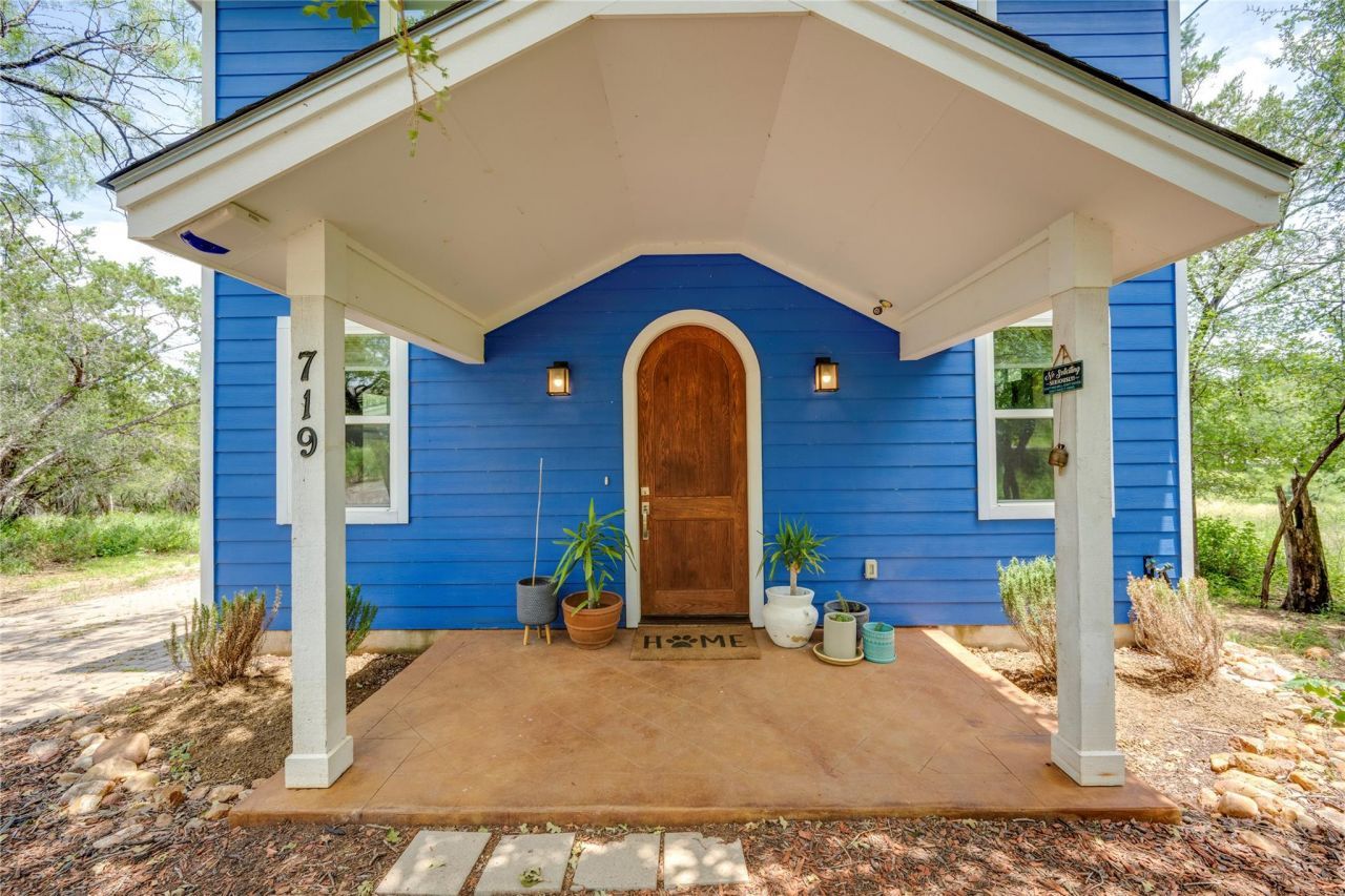 Dreamy blue Hill Country lake cottage in Cottonwood Shores! Built in 2017 with updated interior, you can feel the quality as soon as you walk in. Primary bedroom on main floor with full bathroom, 2 bedrooms and additional full bathroom located upstairs. Spacious double sized lot with high quality deck/bridge overlooking the seasonal creek in the back yard. Additional parking/lot access available from Aspen Ln. Full fenced yard area with natural, low maintenance landscaping. Enjoy a slower pace of life in this charming and quiet community by day with incredible star-gazing at night. Cottonwood shores is a walkable tight-knit lake community including restaurants, bars, a local theatre, nearby hospital, surrounded in abundant nature. Right around one hour from Austin and a short drive to Marble Falls and Horseshoe Bend, this area is slated for significant growth in the near future. This home was built to last by a custom builder. Located on a spacious double lot and charming community, this is an incredible value! Come see today!