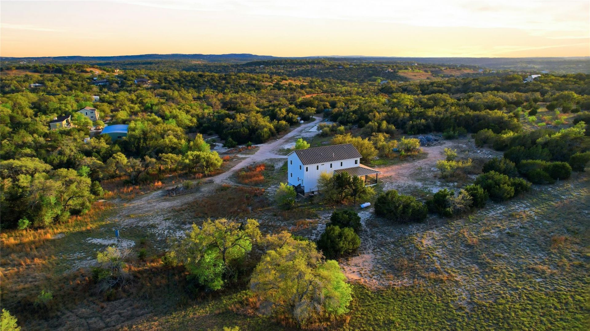 Set atop a scenic hill in Dripping Springs, this modern farmhouse sits on just over 8 private acres and offers sweeping views, mature trees, no HOA, and no deed restrictions. Built in 2021, the 4-bedroom, 3-bathroom home combines thoughtful construction and modern design with an incredible wraparound covered patio for sunrises, sunsets, and everything in between. The home features a light-filled open-concept layout with white oak LVP flooring throughout the main living areas, anchored by a sleek electric fireplace. The kitchen centers around a large island with quartz countertops, expanded dual farmhouse sink, double oven, 5-burner gas stove, upper and side cabinetry, and a walk-in butlers pantry with a whole house reverse osmosis system and water softener. The open dining area, with gorgeous pendant lighting along with seating at the center kitchen island, complete the living space. The well-designed floor plan includes a main-level guest suite with a private bathroom and accessibility features. Upstairs is a flexible bonus space, three additional bedrooms, and two full bathrooms, including the owners suite and bathroom with incredible picturesque views. The spa-inspired primary bathroom features frameless glass enclosing both the walk-in shower and the soaking tub, dual vanities with quartz countertops, and modern ambient lighting. A sophisticated black metal roof adds long-term durability while enhancing the homes modern hill country style. The wooded acreage provides privacy, panoramic views, and ample room to expand or customize the property. The additional pad, already plumbed for a bathroom, shower, washer, and dryer, provides flexibility for future improvements, such as a workshop, barn, living space, or additional structures. The property also benefits from a low 1.6 tax rate and is zoned to top-rated Dripping Springs ISD. This property offers a rare combination of acreage, privacy, and modern farmhouse design in the desirable hill country.